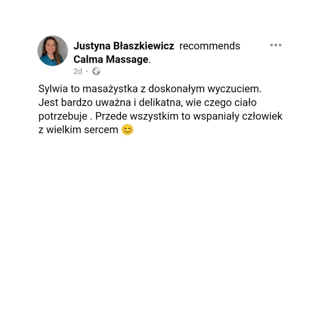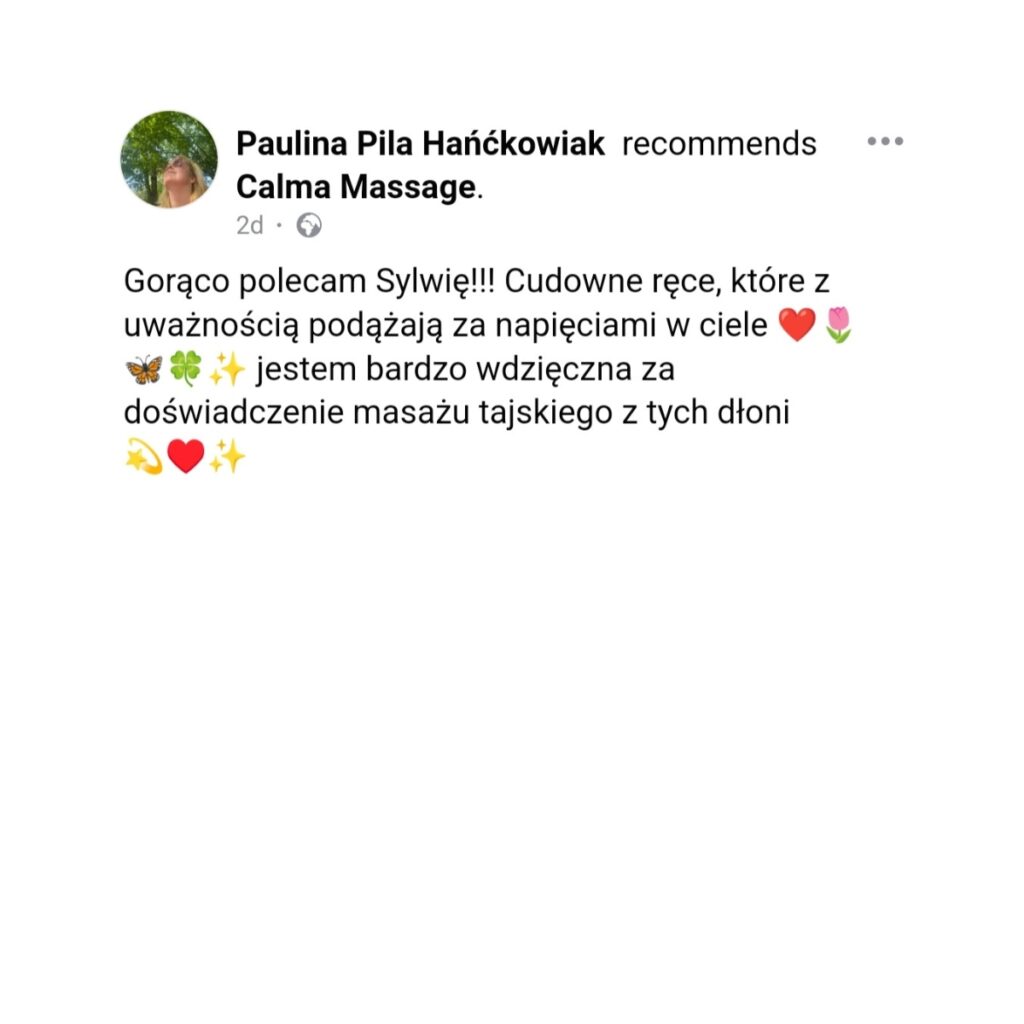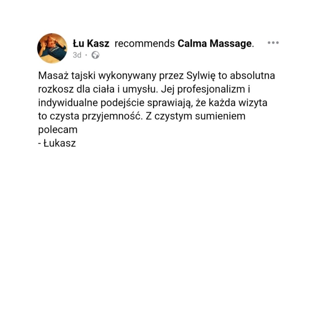 Masaż tajski uwalnia napięcia i emocje, uspokaja, łagodzi stres. Poprawia funkcjonowanie mięśni, narządów, pomaga usuwać toksyny z organizmu, pozytywnie wpływa na odporność i samopoczucie. Tego typu świadomy dotyk to uczta dla ciała i ducha. Przynosi wytchnienie, polepsza zdrowie, wydłuża życie, a przede wszystkim poprawia jego jakość w tu i teraz. Efekty terapeutyczne osiągane podczas sesji masażu pomagają nawiązać lepszy kontakt z naszym ciałem, dodać lekkości i łatwości we wsłuchiwaniu się w jego potrzeby. Zachęcam Cię serdecznie do zadbania o Twoje ciało. Pozwól mi wprowadzić się stan głębokiej relaksacji w moim gabinecie.
